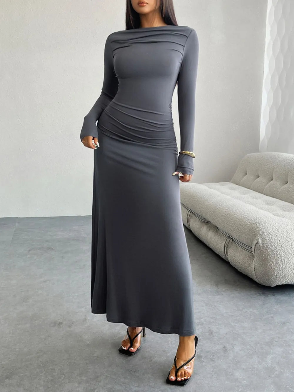 Devine Ruched Long Sleeve Maxi Dress